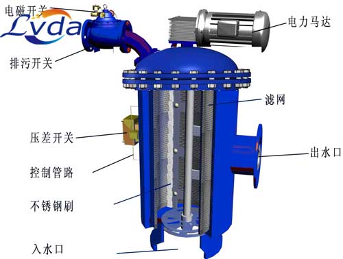 流体从进口流入,从过滤器内楔形滤筒细小的缝隙中流出,杂质微粒很容易被截留下来,杂质微粒在滤网表面积聚时,会产生压差。 当进出口压差达到0.5kg/cm2时(可调),过滤器的反洗系统会开始自动工作。操作由设置在本体上的压差控制器,电动排污阀及靠马达带动的一个能旋转的不锈钢清洗刷,杂质微粒很容易被钢刷刷下来,然后经排污阀排出,反洗时间持续15秒左右(可调),反洗时不断流。